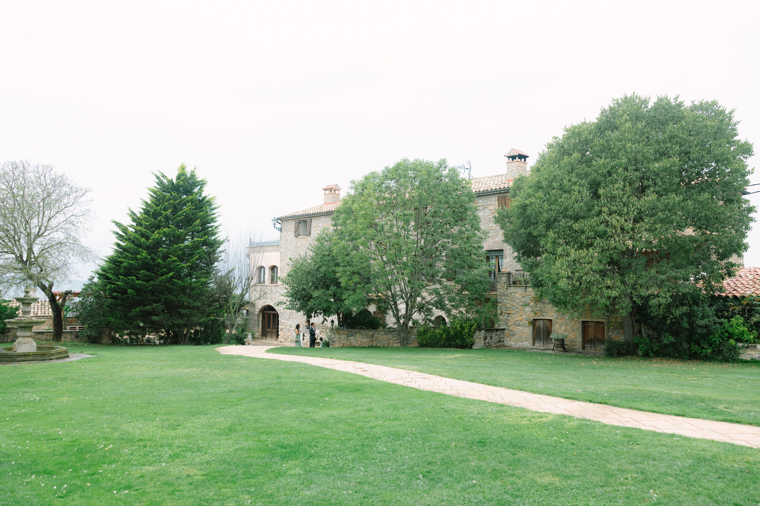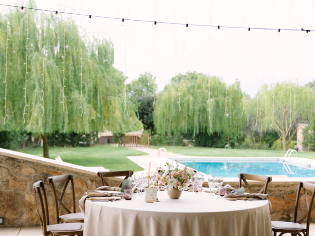 Jardins, bosc i garlandes creen l’ambient; la cerimònia bàsica amb mobiliari i flors ja forma part del paquet, sense costos extres inesperats.